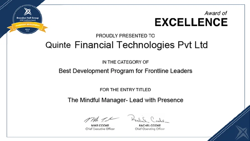 Quinte is thrilled to announce that we have been awarded the prestigious HCM Excellence Awards 2024 – Gold in the category of Best Development Program for Frontline Leaders. This honor, presented by the Brandon Hall Group, recognizes our commitment to leadership excellence and innovation. Our “Mindful Manager” program, a tailored training initiative for frontline managers, was instrumental in securing this award, reflecting our dedication to developing mindful and capable leaders.