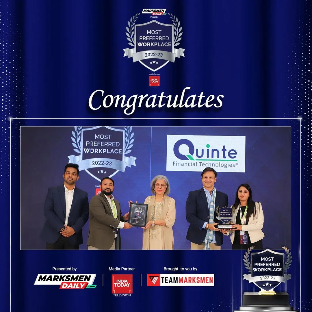 Quinte was recently recognized as a “Most Preferred Workplace 2022-23,” presented by management consulting firm Team Marksmen, in association with Media Partner India Today. Quinte’s partner company, Aithent, also was a recipient of the recognition.